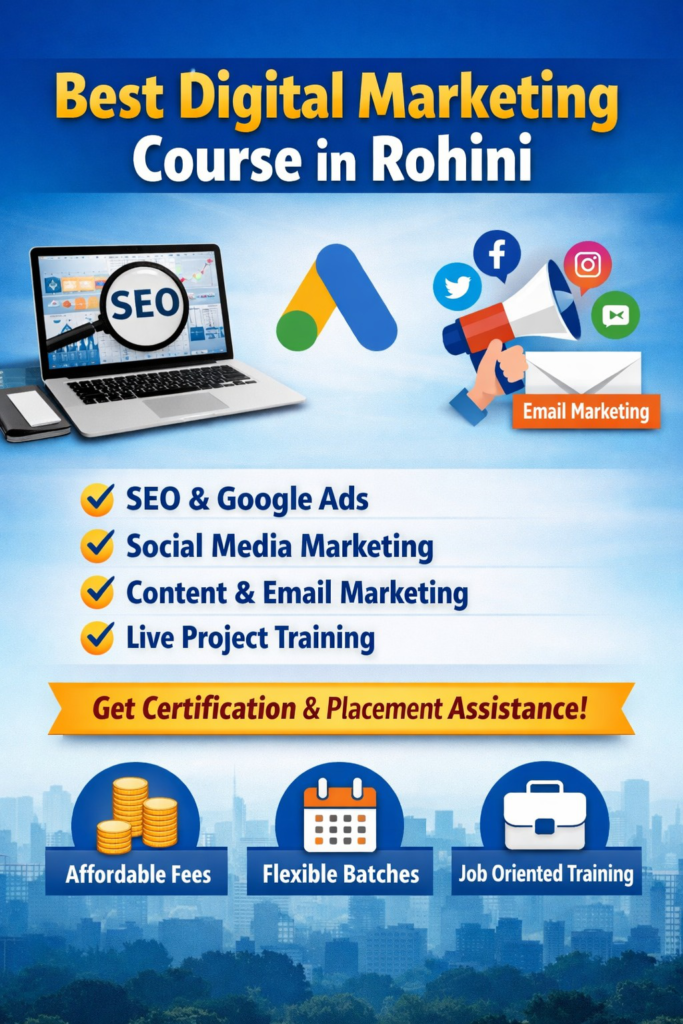 Rohini is one of Delhi’s fastest-growing education hubs, known for professional and skill-based training institutes. Due to its excellent connectivity, experienced trainers, and affordable fee structures, digital marketing training in Rohini attracts students, working professionals, and entrepreneurs from across Delhi NCR.
